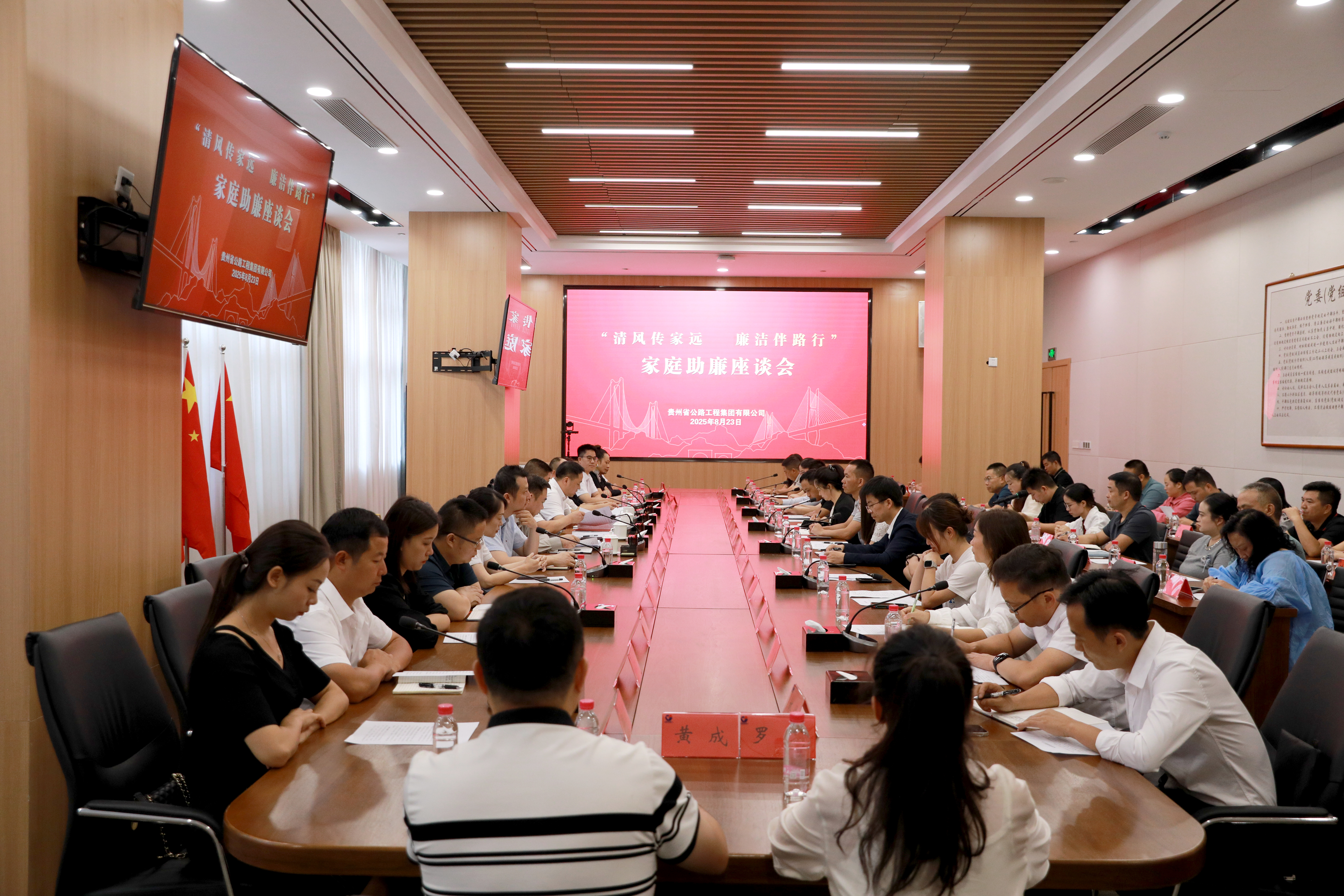 8月23日,贵州公路集团召开“清风传家远 廉洁伴路行”家庭助廉座谈会。集团党委书记、董事长马白虎出席会议并讲话,党委副书记、副董事长、副总经理(主持经营层工作)朱明聪,党委副书记、工会主席崔文武,党委委员、纪委书记张德顺出席会议。司属各单位党政负责人、年轻干部、新提拔干部、关键岗位人员及家属代表共计50余人参加座谈会。