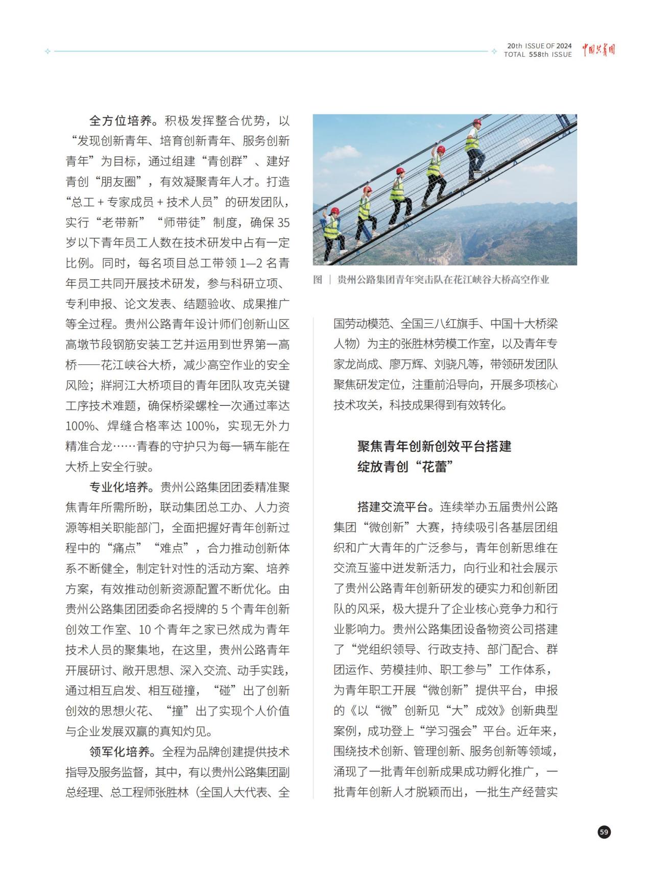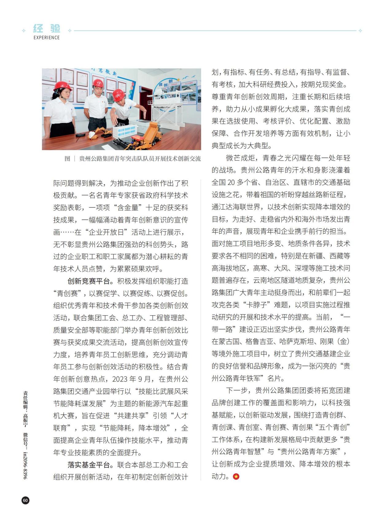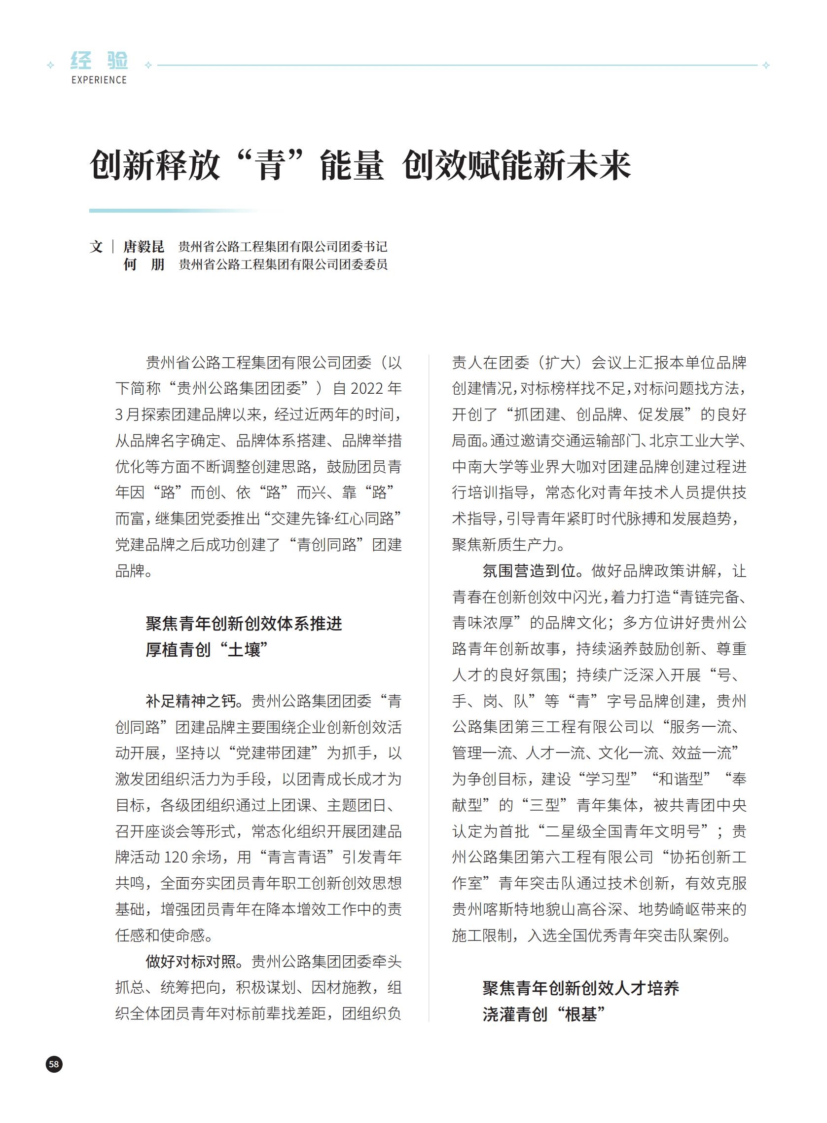 近日,由共青团中央主办的《中国共青团》杂志于2024年第20期,在经验专栏刊登了题为《创新释放“青”能量 创效赋能新未来》的署名文章,报道了贵州公路集团团委“青创同路”团建品牌创建工作成果和经验启示。