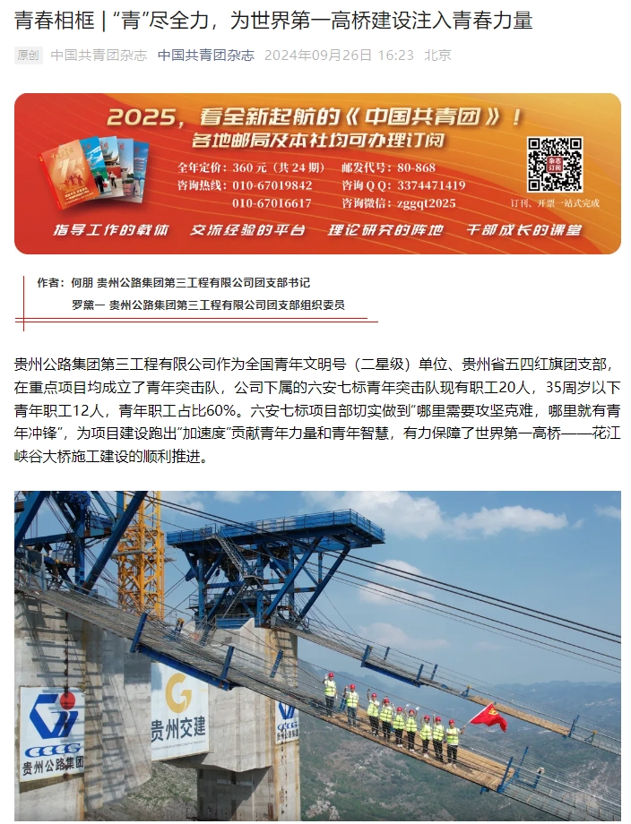 9月26日,“中国共青团杂志”官微以《 “青”尽全力,为世界第一高桥建设注入青春力量》为题,报道了贵州公路集团第三工程公司青年突击队风采。