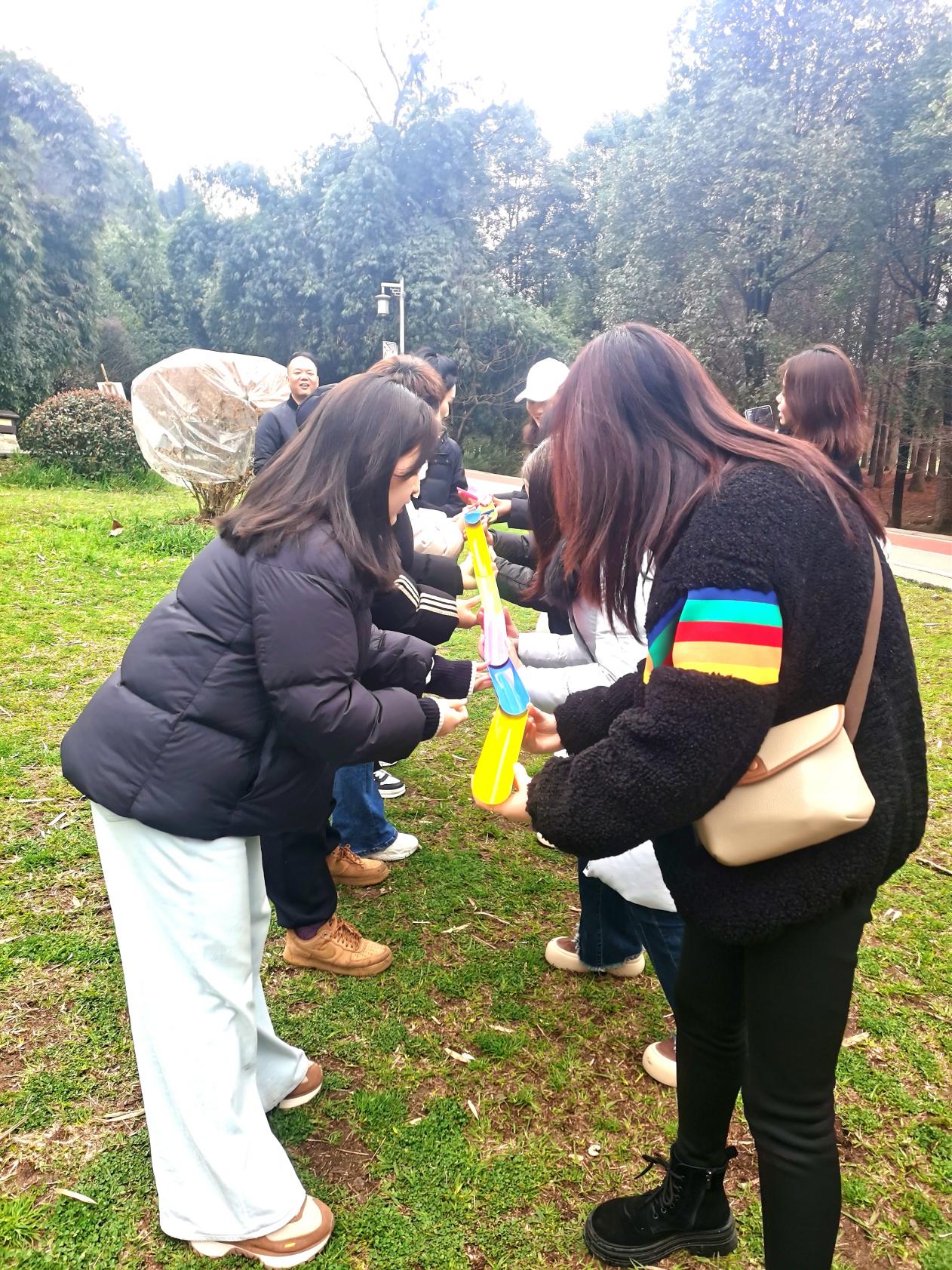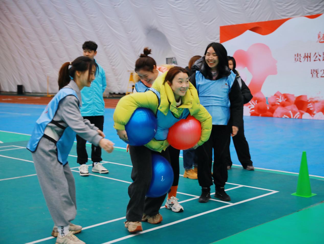 学法环节刚结束,现场秒变“大型团建现场”。“企鹅漫步”赛道上,大家抱着瑜伽球摇摇晃晃,像极了QQ表情包;“四人五足”环节,虽然喊着“一二一”却集体顺拐;“同舟共济”环节,大家挥洒汗水、团结协作,展现出巾帼不让须眉的飒爽英姿。