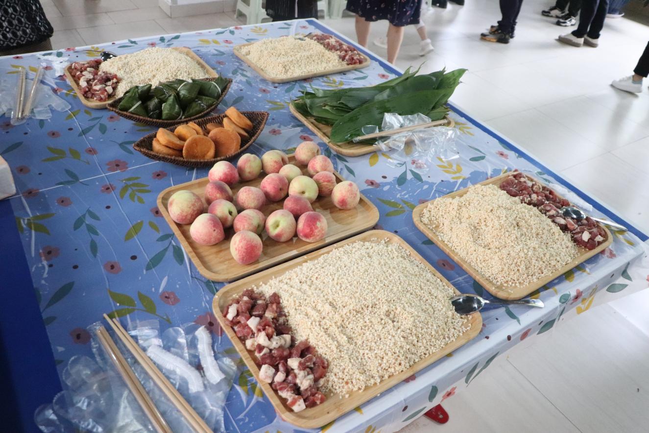 6月19日下午,汇金府传来一阵阵爽朗的笑声。物业工作人员已把提前泡好的糯米、粽叶、腌制好的猪肉、丝线等材料整齐地摆放在长桌上,同时还准备了水果和糕点。