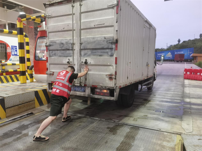 6月23日中午,一辆苏F牌照大件运输车辆需在兴义环城高速公路景峰收费站下高速,过车道地磅时,由于装载货物超宽,无法正常通行。当班收费员见状,立即将该情况上报当班站点总务范彬和班长熊欣。