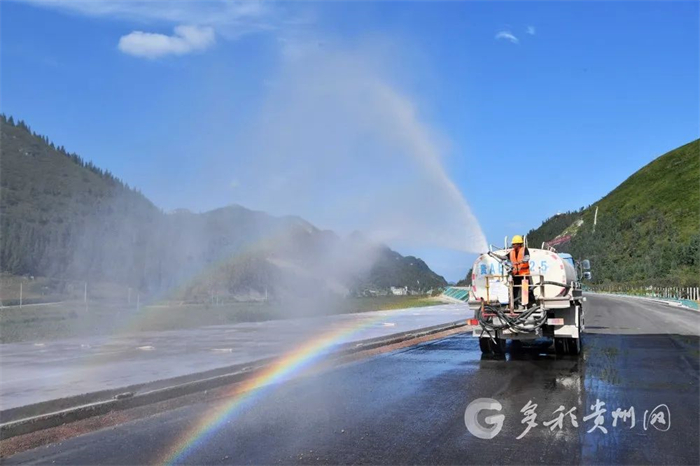 项目部施工人员正在对路面高分子养身膜洒水养护