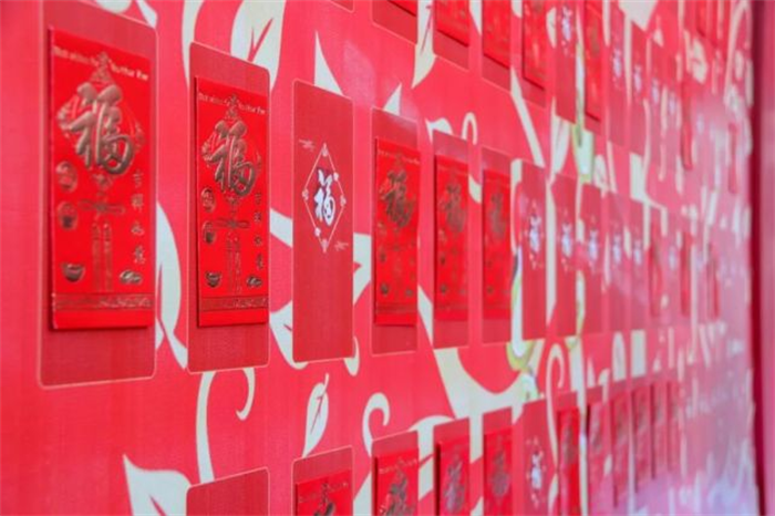 利用红包制作一面红包墙。住酒店的客人凭房卡抽取一个红包。