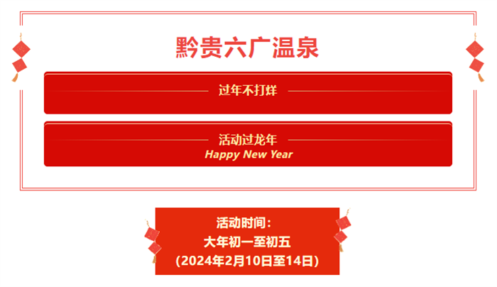 在这个春节与寒假重叠的假期,黔贵六广温泉为广大游客准备了一系列精彩纷呈的活动。我们希望在这寒冷的冬季,共同迎接新春的同时,享受温泉带来的温暖与快乐!