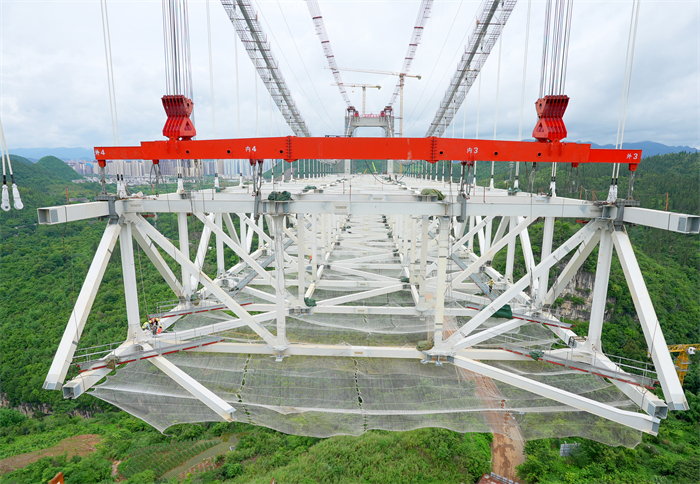 作为贵州省跨径最大的市政悬索桥,金州大桥全长1600米,主跨450米,主桥共设有44个钢桁梁节段。今年3月31日,大桥开始首节段钢桁梁吊装,当前吊装进度已达98%,整体形象进度约96%,项目部正在着手推进主桥钢纵梁吊装、桥面板安装、引桥湿接缝焊接以及桥梁附属工程施工等。
