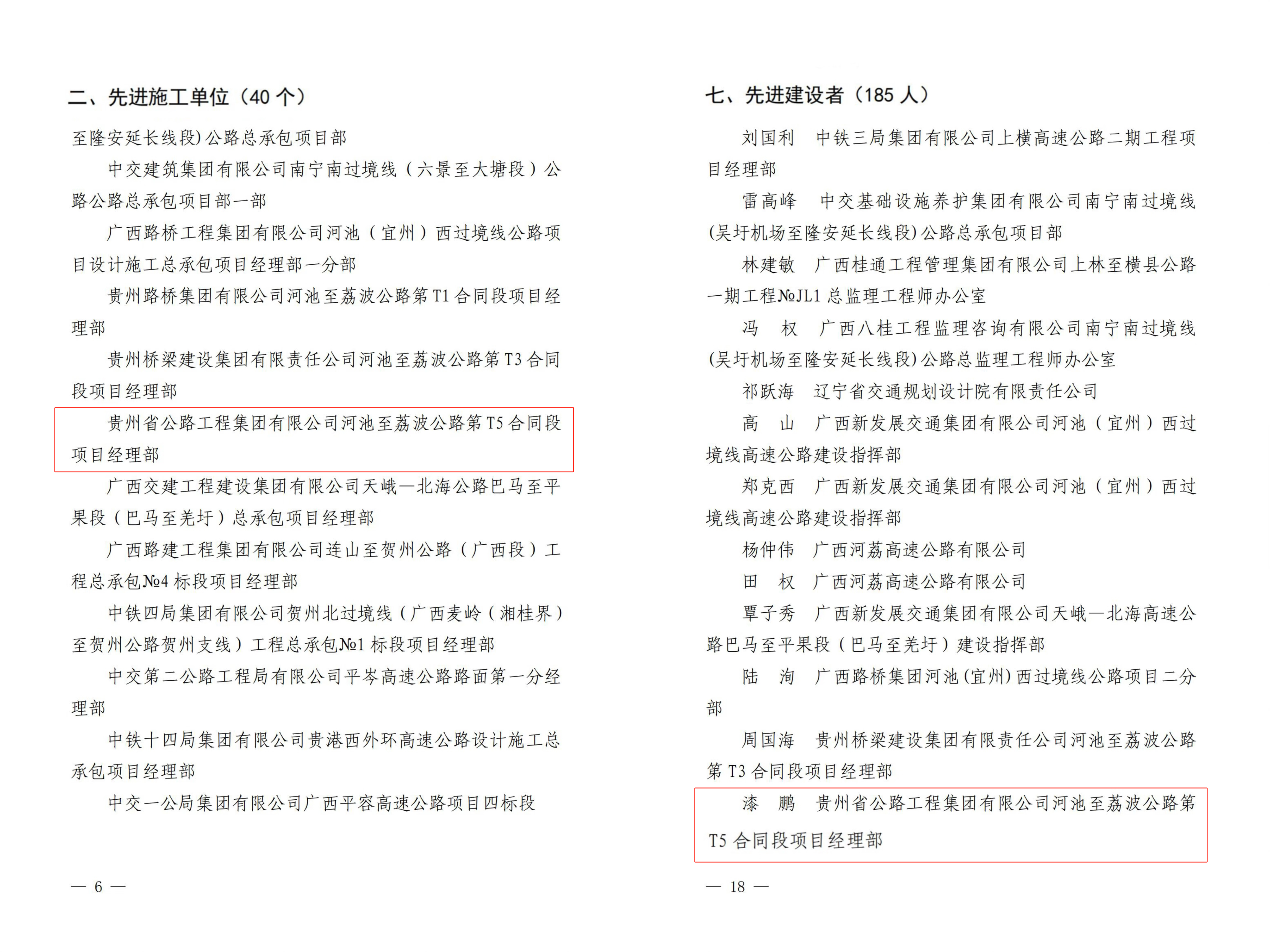 日前,2024年度广西高速公路建设先进单位和先进个人名单公布,贵州公路集团第六工程公司广西河荔5标项目部荣获“先进施工单位”称号,河荔5标项目经理漆鹏荣获“先进建设者”称号。