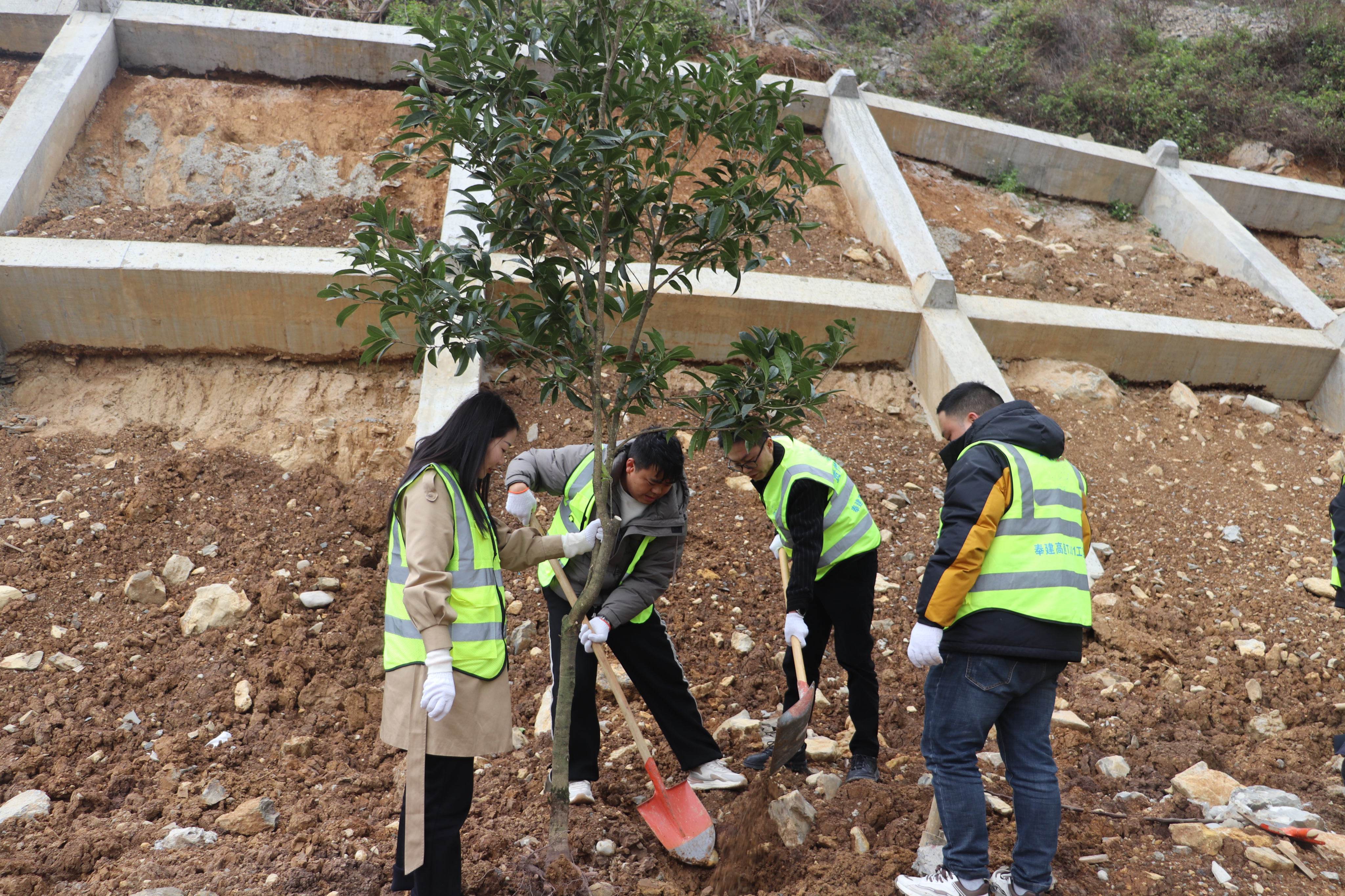 在大沙坡大桥弃土场,荔河3标的职工们早早来到植树现场领取植树工具,大家或两两合作,或三五成群,挖坑、栽树、覆土、踩实,干得十分起劲儿,短短1个小时就种下了20余株桂花树。活动还设置了“认养树苗”环节,职工们亲手栽种的树苗挂上专属铭牌,并写下心愿寄语,为这份绿意赋予了更多美好期待。