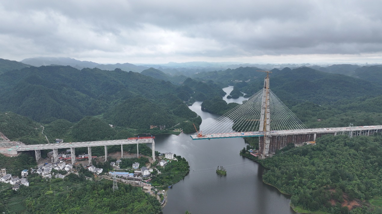 百花湖大桥主桥上部结构贵阳岸采用预应力混凝土π型梁,安顺岸采用双边箱钢混组合梁。截至目前,百花湖大桥已经完成主跨钢主梁GZL17的吊装及第17号斜拉索安装任务。
