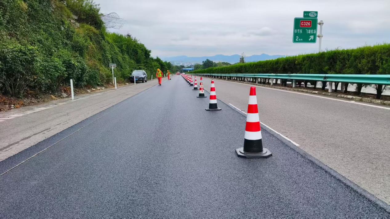 项目在施工中严格落实高速运营、高速交警、交通综合执法等部门制定的交通疏导方案并积极主动沟通,结合现场实际不断优化施工方案,持续增加人、机、料投入,高质量、高标准完成 DTO高延弹超薄罩面施工任务。