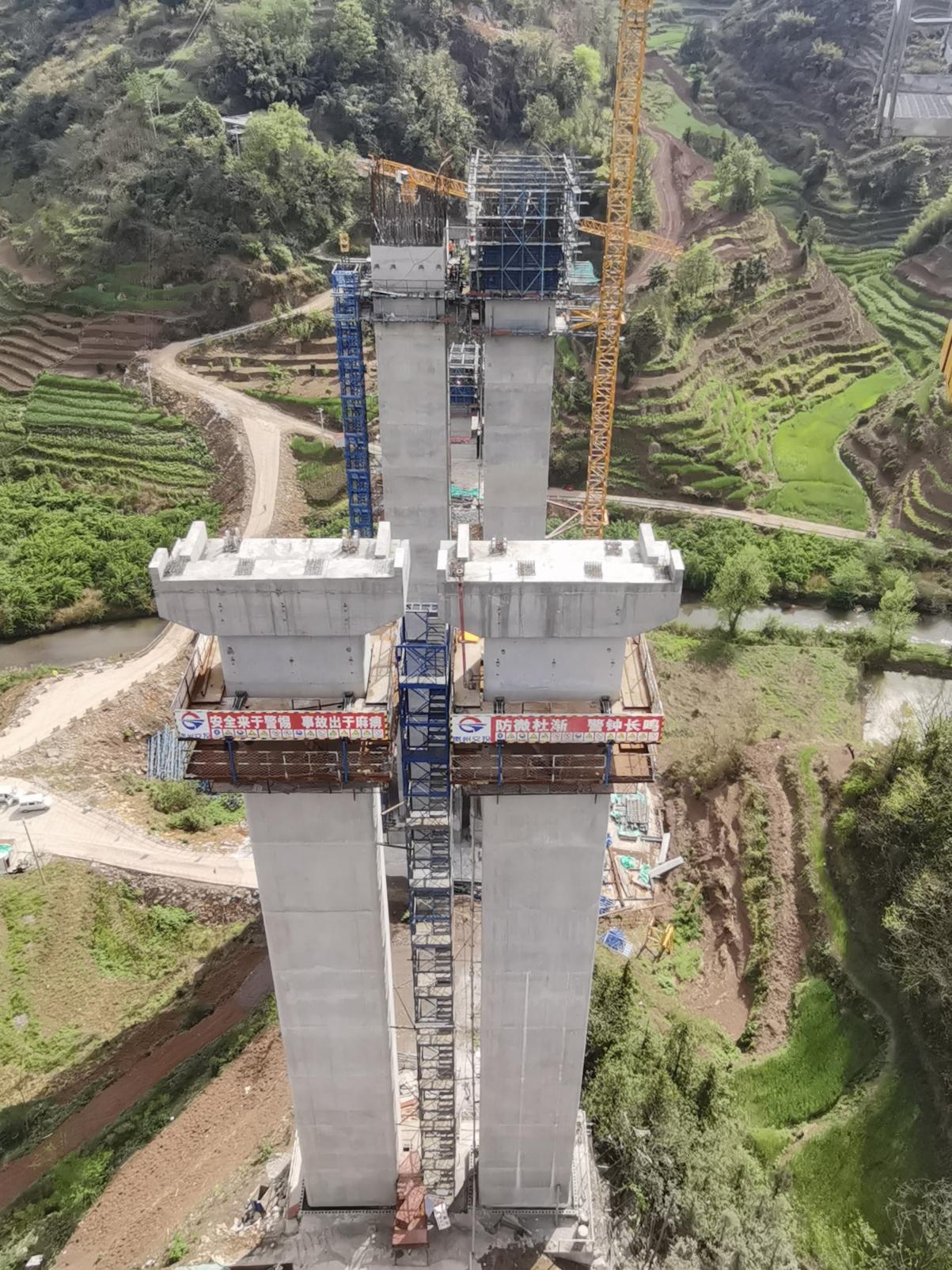 桥梁上跨地方道路与河谷地带,施工区域地形陡峭、作业面狭窄,地质条件复杂,主要为强风化砂岩、粉质粘土,高墩施工对模板精度、垂直度控制及高空作业安全要求较高。复工以来,项目团队制定专项施工方案,实行全程旁站监督,严控混凝土质量,高效推进工程建设。