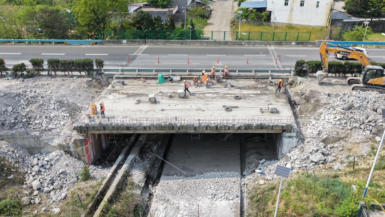 作为项目重点控制性工程,该桥全长32.04米,采用“保留上部结构、置换下部结构”方案施工,本次拆除下行空心板共8片,总重230.7吨,其中边板单重38.6吨、中板单重30.7吨,为后续桥梁改造扫清关键障碍。