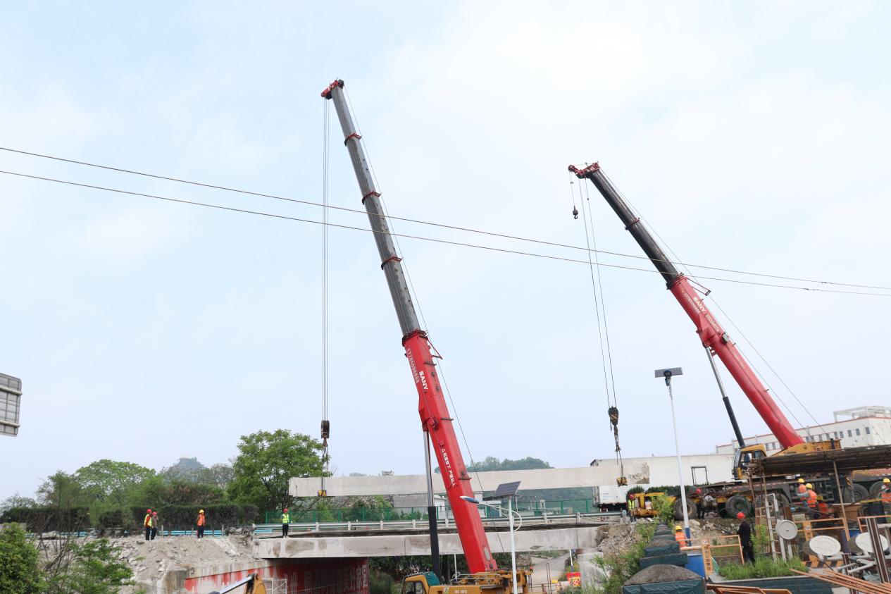 面对涉路施工交通组织难、车流量大、工期紧等多重挑战,项目部提前对接“一路三方”开展现场实地勘察,科学确定高速公路借道开口位置。同时周密部署安全保障举措:规范布设790米借道改道及隔离桩、安全防护设施,完成桥下道路改移与封闭警戒;组织专项安全技术交底,强化施工流程与风险防控培训;安排专人全程监护,全面排查吊装设备高度限位器、重量限制器等安全附件,确保作业全程安全高效。