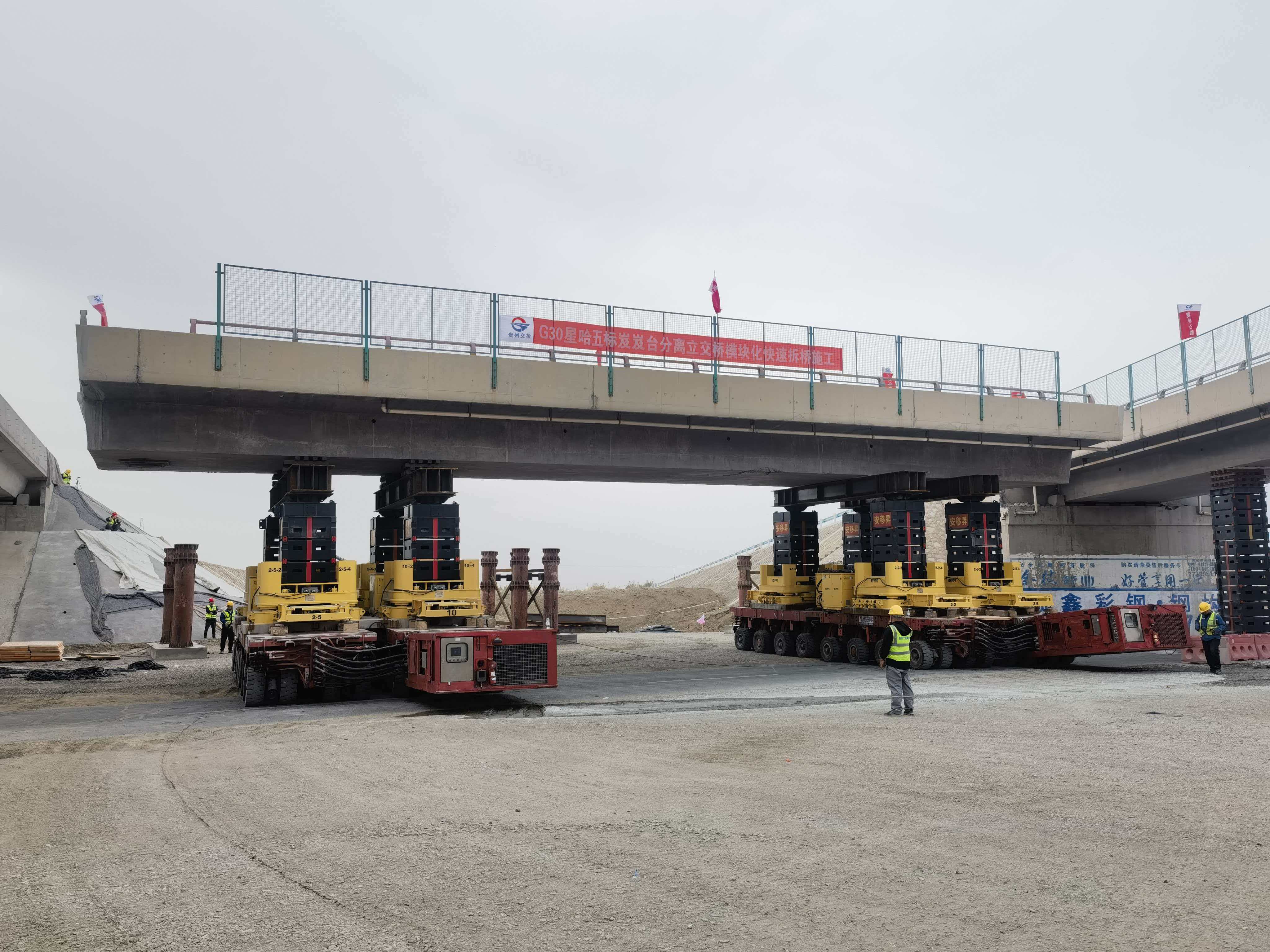 项目地处戈壁荒漠,面临气候干旱、保通压力大、桥梁施工复杂等多重挑战。建设团队引入智慧建造技术,将北斗定位、智能传感融入路面施工,对碾压遍数、压实厚度等实时监控,实现“云端管控、过程可溯”。2025年10月13日,项目部首次采用SPMT模块化快速拆桥技术,顺利完成芨芨台分离式立交桥首跨拆除作业,仅用5小时完成设备就位、切割、落梁及转运全流程,单次最大吊装重量达500吨,最大限度减少了对交通的影响。