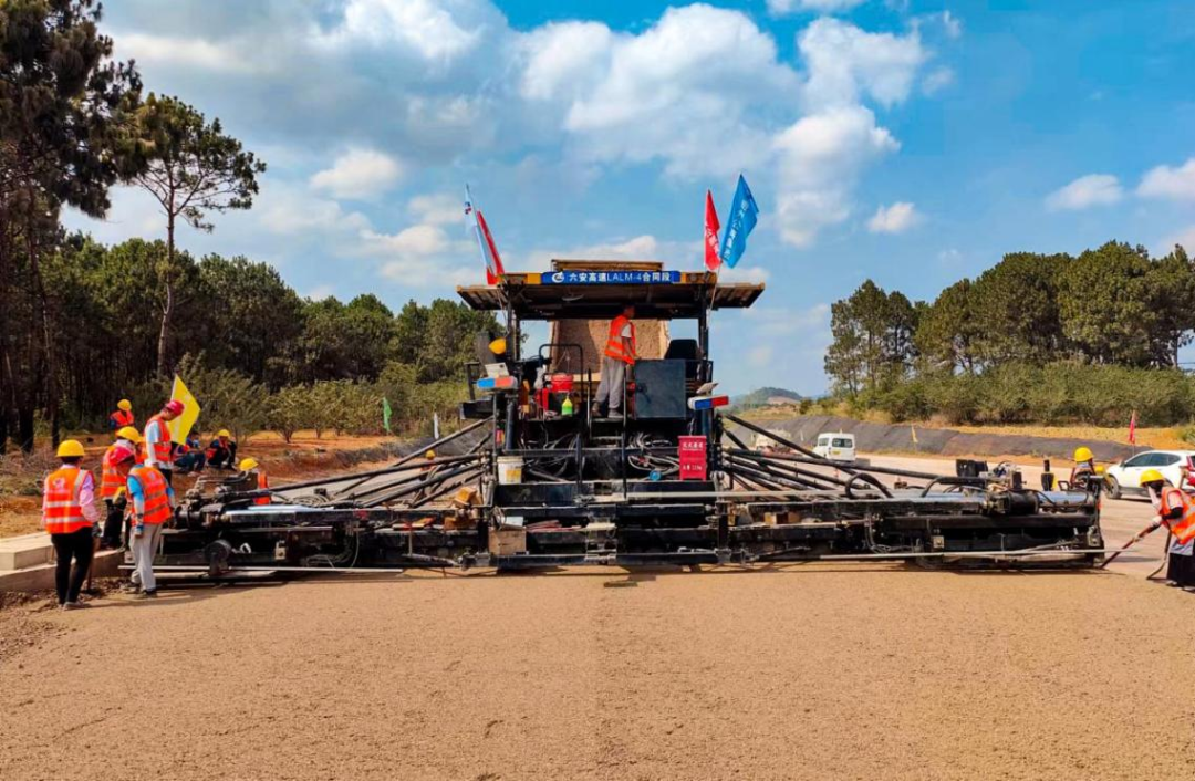六安路面4标全长41.98公里,对应土建11、12、13、14标,桥隧比为18.63%,路线途经安龙县的张家沟、笃山镇、钱相街道,设T型枢纽互通与汕昆高速搭接;项目主要施工内容为主线、匝道、互通连接线路面工程以及K111+460-K150+698段景观绿化工程及桥梁防水层施工。此次摊铺路段全长550米,宽12.75米,厚20厘米。