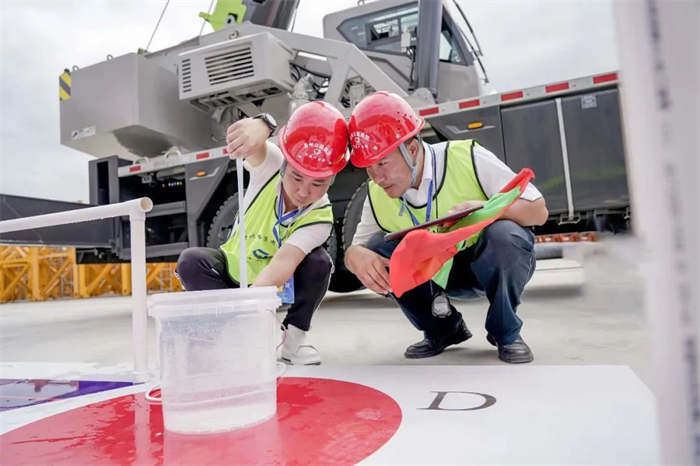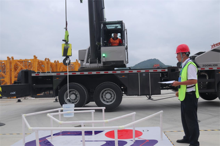 启动、前行、停车、接电,选手们有条不紊、一气呵成。来到吊装区域,伸支腿、起臂、下钩,选手们将装满水的水桶挂上吊车副钩,在水桶离地20-40厘米后将其沿集团公司LOGO轨道移动一圈,并尽可能保持平稳。
