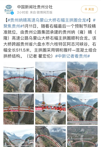 1月11日下午,随着右幅最后一个预制节段精准就位,由贵州交建集团投资,贵州公路集团第八工程公司承建的纳晴高速乌蒙山特大桥右幅主拱圈顺利合龙,为纳晴高速全线建成通车奠定了坚实基础。