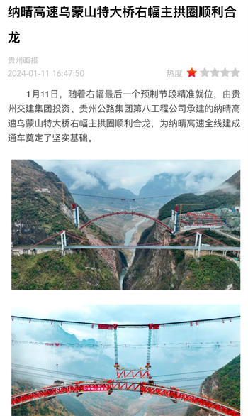 大干开新局 | 乌蒙山特大桥右幅主拱圈顺利合龙