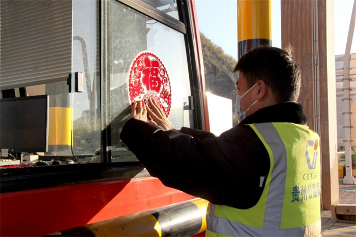 兴义环高公司职工在收费站现场贴上红窗花