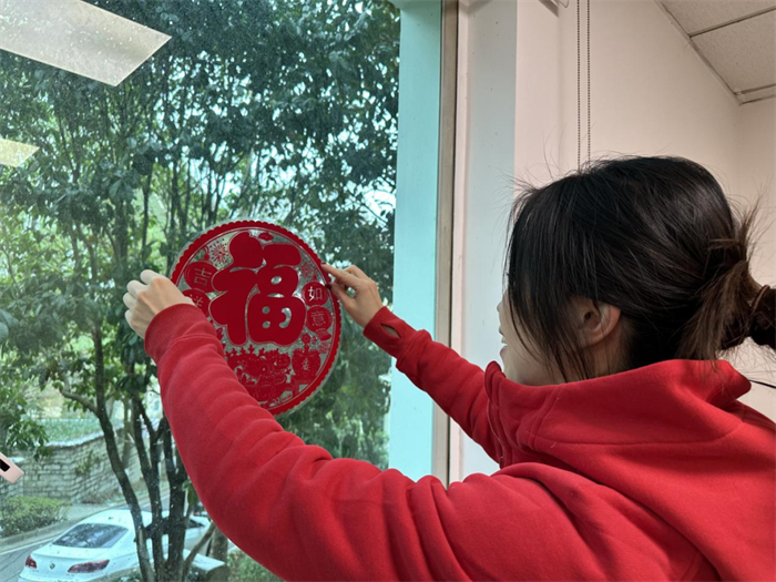 林都园林公司职工在办公区贴上窗花