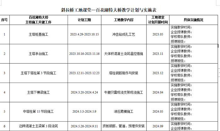 在项目建设现场,我们发现了两张特别的表格,一张是“‘工地课堂’教学计划与实施表”,另一张则是“‘工地课堂’教学团队表”,表格上的内容按照大桥的关键工序和工期,制定了不同的教学内容,而授课教师除了学校的老师之外,还有项目现场的工程师们。这是一个怎样的“工地课堂”?学生们在这里可以学到哪些知识?带着这些疑问,我们走进了百花湖特大桥的“工地课堂”。