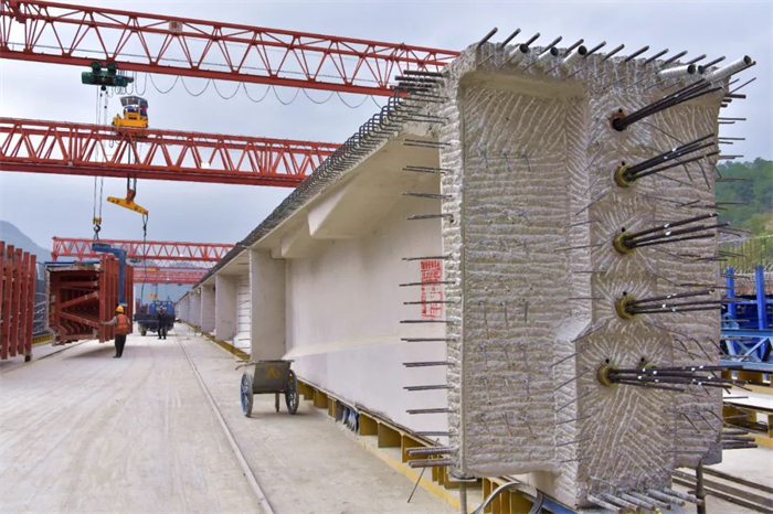 此次浇筑的乌蒙山大桥右幅20-2#预制T梁,设计长度20米、高1.5米、宽1.7米,设计混凝土强度C50,设计方量17.32立方米。