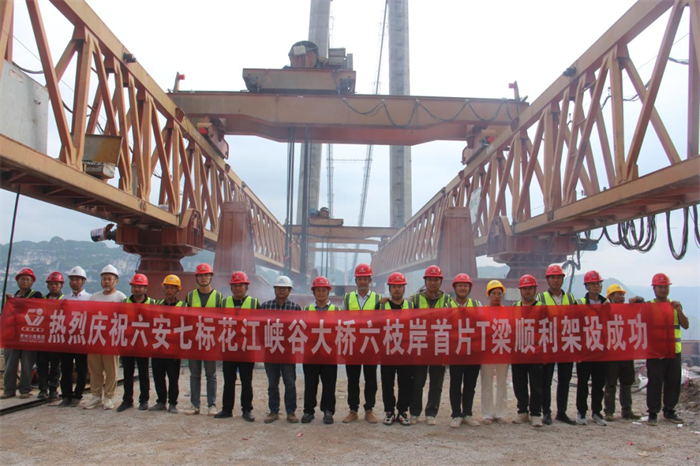 项目团队精心组织、合理安排,T梁预制场到引桥架设现场的距离为27公里,项目部在各路口设专职安全员,负责指挥来往施工车辆,为运梁车提供专线服务,确保运梁道路畅通。花江峡谷大桥六枝岸引桥首片T梁顺利架设,不仅为后续梁片的架设工作奠定了坚实基础,也标志着六安7标整体施工迈入最后冲刺阶段。