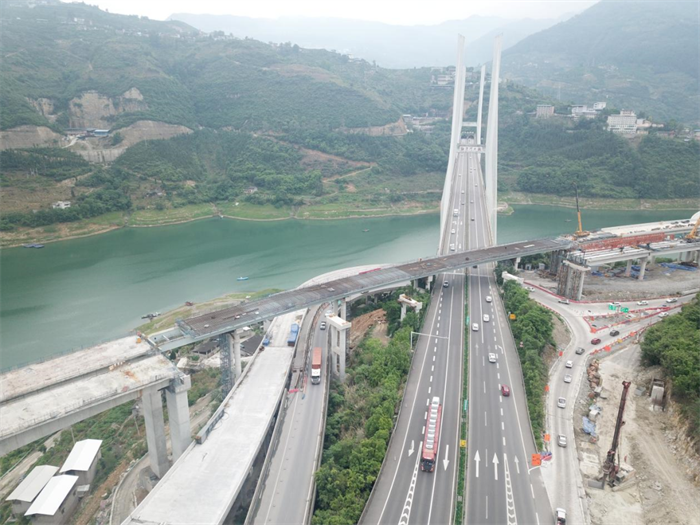 由于唐家湾大桥右幅跨越现有通行的安来高速、沪蓉高速,以及新建的奉建高速奉节东互通F匝道,加之钢混组合梁施工区位于梅溪河左岸斜坡地带,地势险峻,为桥梁施工带来较大困难。为确保钢箱梁顶推施工顺利推进,项目部开展了详尽的前期技术策划,对钢箱梁制造运输路线、顶推总体方案及场地部署、临时结构设施设计、施工队伍选用等方面进行了周密部署。同时,项目建设团队针对施工环境特点及方案重难点进行深入剖析,创新了步履式钢箱梁顶推施工技术,高效、安全地保障了右幅钢箱梁顶推施工的顺利进行。