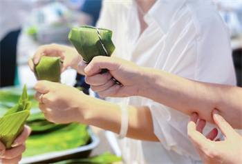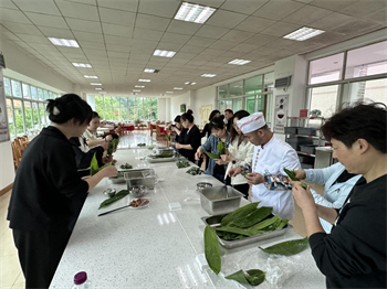 来自集团总部和司属各单位的职工纷纷入场,围绕食堂师傅成一圈,学习包粽子的步骤和技巧。在师傅的细心教授和指导下,大家纷纷动起手来,选叶、叠叶、填料、压实、捆线。虽然在技巧上还略有生疏,但大家神情专注,心眼手合一,不一会儿,一个成品粽子呈现在眼前。