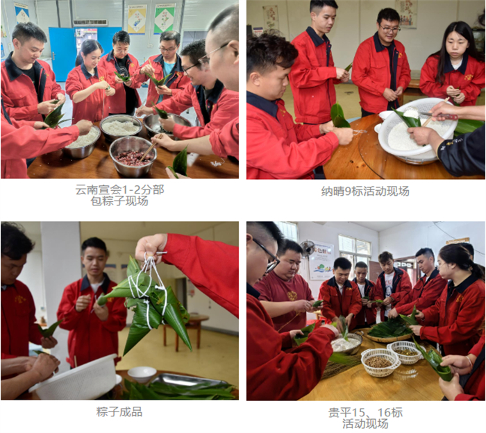 6月9日,贵州公路集团第三工程有限公司云南会巧项目组织端午节包粽子、挂艾草活动。大家纷纷拿出自己的“绝活”,做粽叶漏斗、填糯米、加馅料、包裹、捆绑,每个步骤有条不紊,井然有序,一片片清香的粽叶、一粒粒晶莹的糯米,在一双双巧手下变成一个个味美形佳的粽子,活动现场欢声笑语,其乐融融。