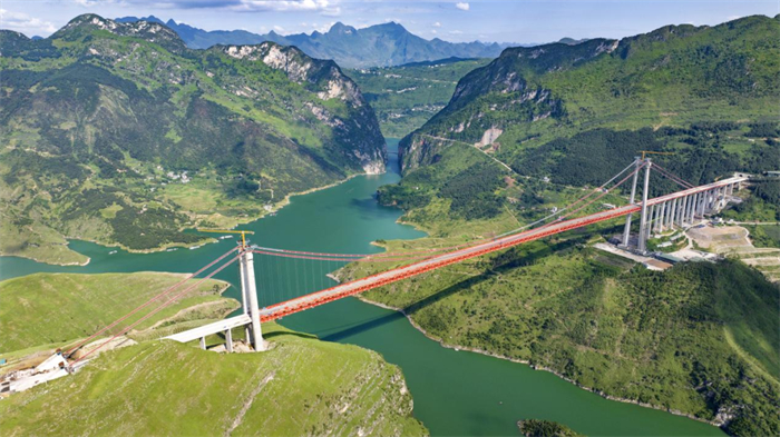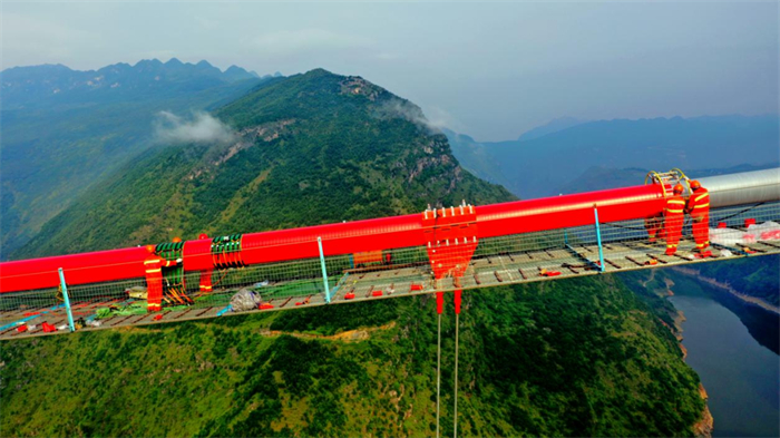 7月21日,伴随着最后一圈桔红色“丝带”均匀密实地缠绕在直径80公分的主缆上,首座“纯贵州造”悬索桥——纳晴高速牂牁江大桥主缆防护施工顺利完成。