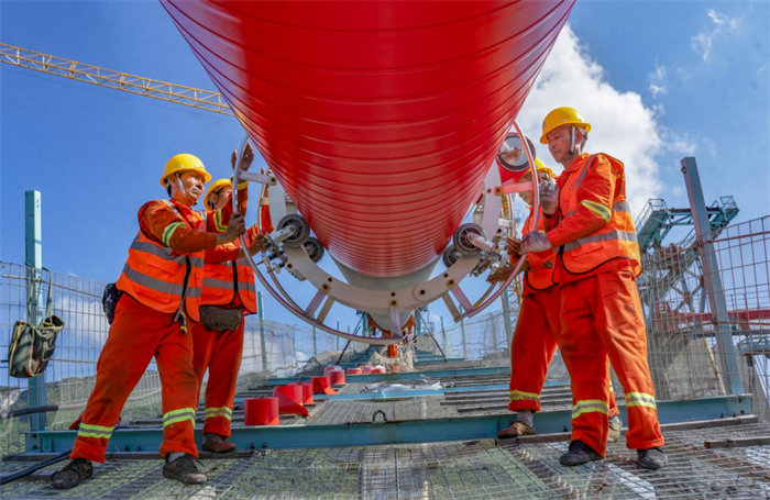牂牁江大桥的主缆防护施工采用了厚度为1.2毫米、以9×9涤纶网格布增强的改性氯磺化聚乙烯层压制品制成的防护带,具有极强的防水性、耐碱性以及抗老化性能。施工过程中,建设者按照螺旋式的层叠绕法,一圈压着一圈地使主缆表面覆盖双层、甚至三层防护带,并通过全面加热熔接增强密封性,这就相当于为桥梁主缆穿上了一件严严实实的“防护服”,可以为其遮风避雨、防潮防晒,有效阻挡水分等介质对主缆钢丝的侵蚀。