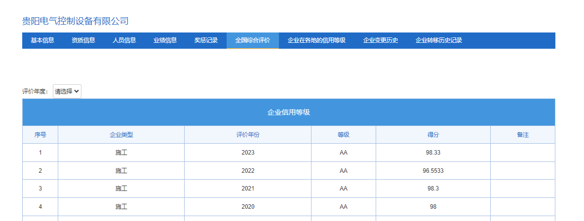 贵阳电气控制设备有限公司连续四年获评AA等级