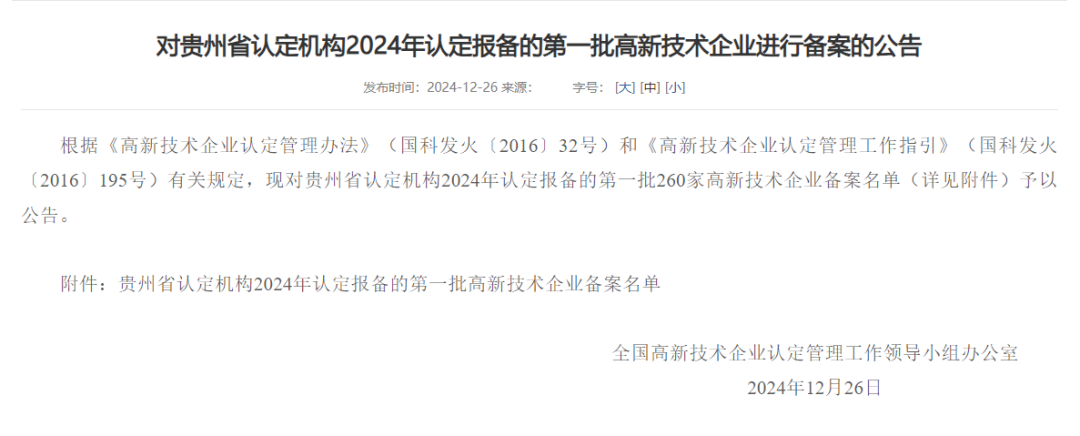 日前,全国高新技术企业认定管理工作领导小组办公室公布了“对贵州省认定机构2024年认定报备的第一批260家高新技术企业备案名单”,贵州黔贵工程技术服务咨询有限公司顺利通过认定,升级为“国家级”高新技术企业。