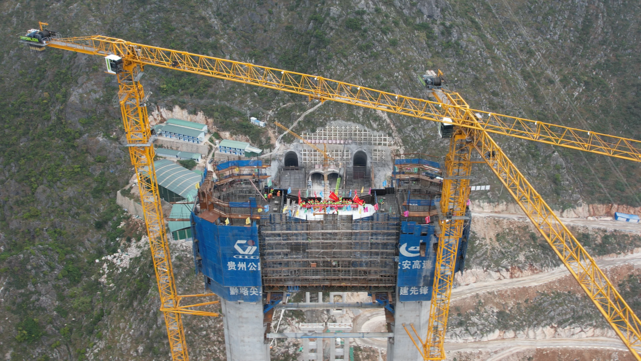 花江峡谷大桥5号主塔上横梁底板铺设。