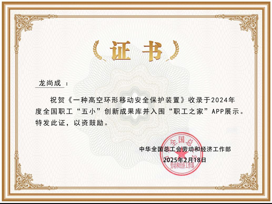 近日,由贵州公路运输设备物资有限公司劳模创新工作室自主研发的装置“一种高空环形移动安全保护装置”成功被收录到2024年度全国职工“五小”创新成果库,并在“职工之家”APP进行展示。凭借巧妙的机械设计和极致的实用性,这一微创新成果大大降低了高空作业安全隐患,成为一线工人高空作业的“隐形守护者”。
