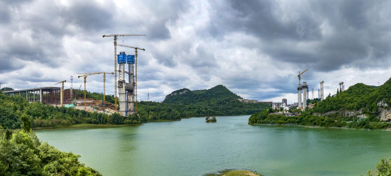 百花湖大桥是贵州省内同类型最大规模混合梁单塔斜拉桥,大桥全长1086米,主塔高219米。项目位于贵州省清镇市与观山湖区交界处,横跨百花湖二级水源保护区,主塔毗邻百花湖,环水保要求极高。自2023年3月桩基施工启动以来,项目团队高度重视生态环境保护,采用闭环管理模式,通过三级沉淀池、浆液分离系统等技术实现施工污水零排放,未发生任何水源污染事件。针对富水岩溶桩基、超高混凝土主塔建设等技术难题,项目团队研发应用了空压反循环清孔净化装置、大体积混凝土智能温控系统等关键技术,创新塔梁同步施工、纵移式桥面吊机钢混结合段施工等工艺,高质量完成桥梁主体工程建设。