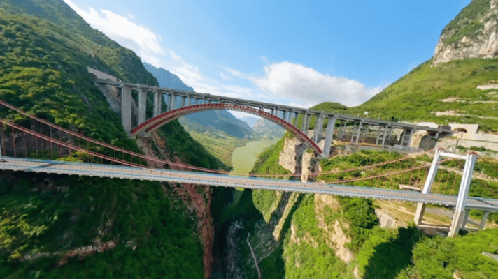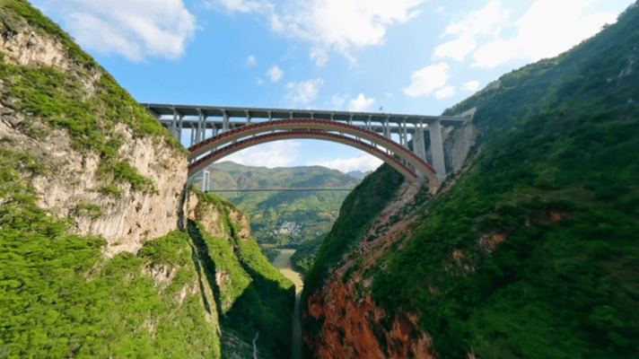 乌蒙山大桥,位于贵州省六盘水市水城区境内,是纳晴高速重点控制性工程之一。大桥左幅全长491.5米,右幅全长511.5米,桥面到水面垂直距离308米,是世界首座大跨度钢桁腹杆—混凝土组合拱桥。建设过程中形成的山区大跨度钢桁腹杆-混凝土组合拱桥施工技术体系,丰富了200米至400米跨径的桥梁结构类型,成为我国具有里程碑意义的桥梁。