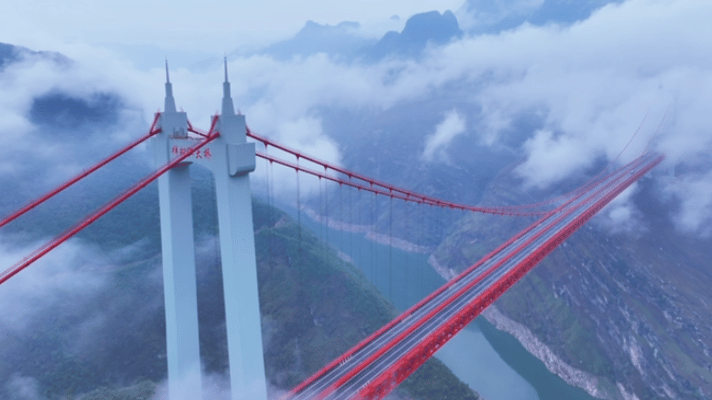牂牁江大桥位于贵州晴隆、普安、水城、六枝4县(区)交界处,横跨牂牁江,是纳晴高速公路重点控制性工程。大桥主跨1080米,全长1849米,桥面距江面最高距离380米,是第1座真正意义上实现全过程“纯贵州造”的悬索桥,位列世界百座高桥第13位。大桥于2021年11月开工建设,2025年2月建成通车。