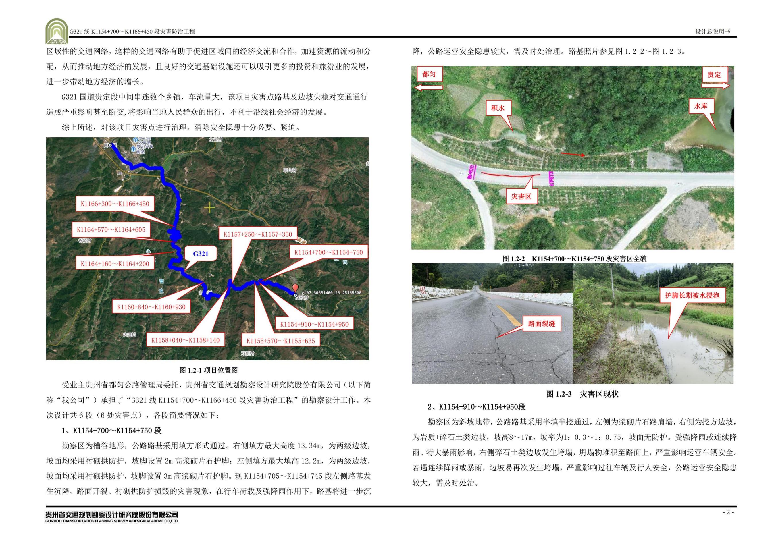 G321广州至成都公路K1154+700~K1166+450段位于贵定县昌明镇,为二级公路,受连续降雨影响,该路段沿线发生路基沉陷、路面开裂、边坡碎落、掉块等地质灾害。根据对灾害等级的核定,本项目共9个灾害点,其中6个二级风险点,3个三级风险点,将采用“微型钢管桩+路基注浆”“坡面整理+框架锚杆+SNS主动防护网”“清除坡面危悬石,挂主动防护网、实体护面墙”等措施进行综合处治;同时对损坏的路面、交安、排水工程进行恢复。