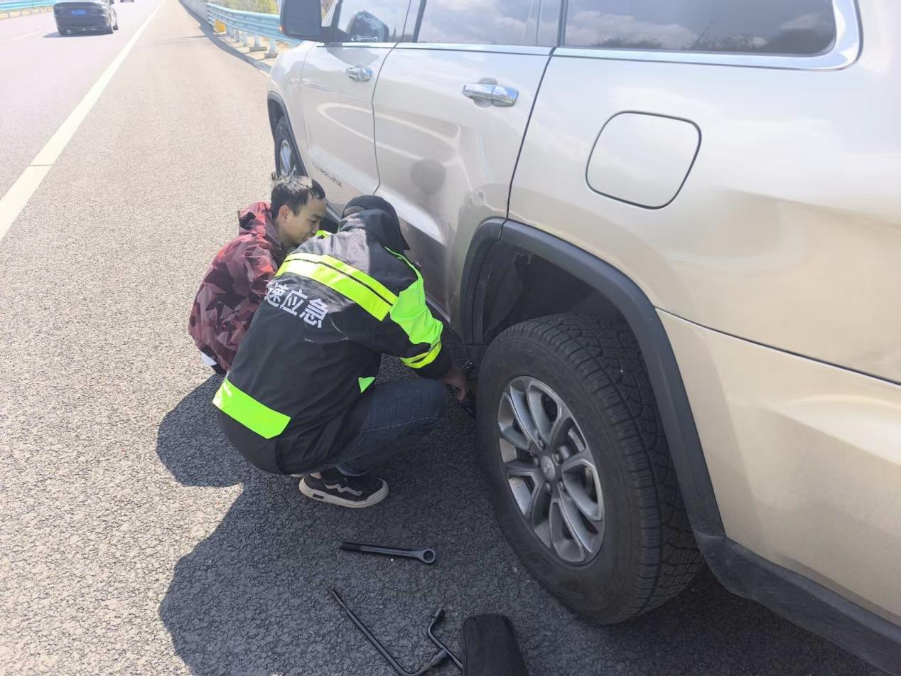 节日期间,公路养护分公司六安高速郎岱应急队暖心帮助车主更换备胎。