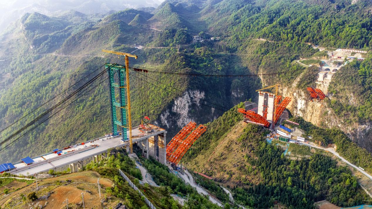 面对复杂地形、高空作业、高精度施工等多重考验,项目团队科学统筹、精准施策,不断优化、细化施工方案,加大资源设备投入。在主拱圈吊装施工中,采用全套智能监控系统和北斗定位系统,实现施工过程主动纠偏、自动化监测预警,为高空作业全方位安全护航。同时,不断强化现场质量安全管控,严把材料和工艺关,全面落实作业人员安全技术交底,常态化开展日常隐患排查与全过程施工监管,多措并举保障大桥建设平稳有序推进。