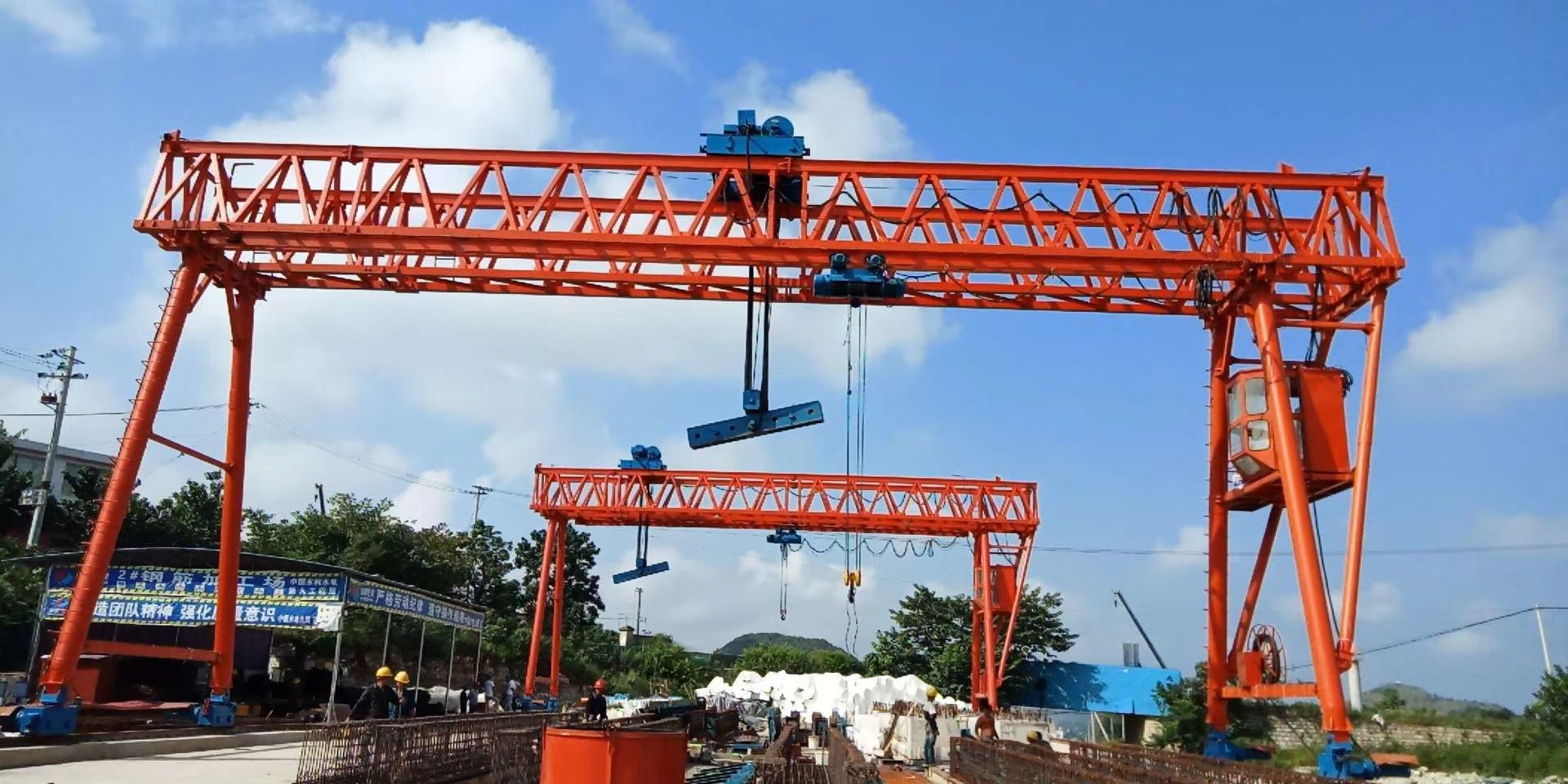 门式起重机是桥式起重机的一种变形,又叫龙门吊。主要用于室外的货场、料场货、散货的装卸作业。门式起重机具有场地利用率高、作业范围大、适应面广、通用性强等特点,它的金属结构像门形框架,承载主梁下安装两条支脚,可以直接在地面的轨道上行走,主梁两端可以具有外伸悬臂梁。