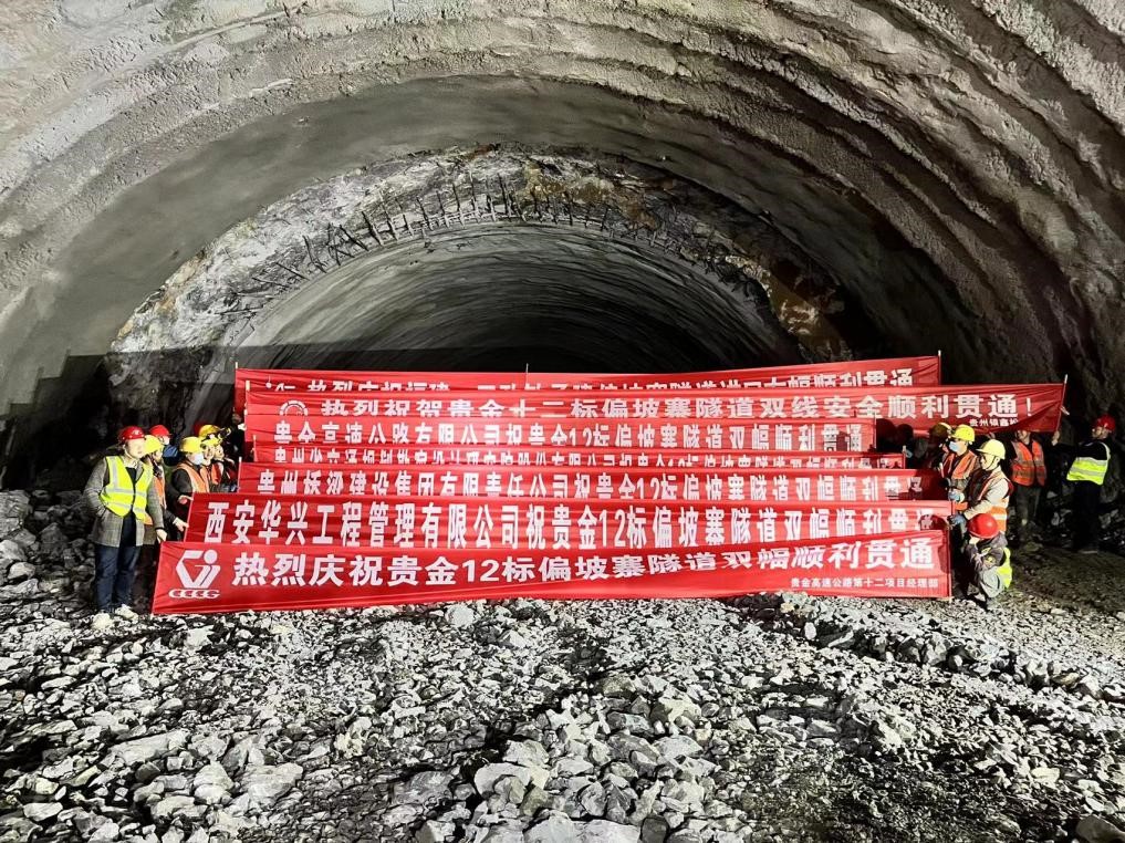 2023年2月17日,随着控制性工程偏坡寨隧道右幅顺利贯通,贵金12标圆满完成双幅全标段贯通任务。