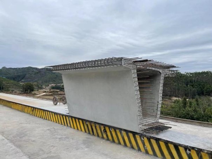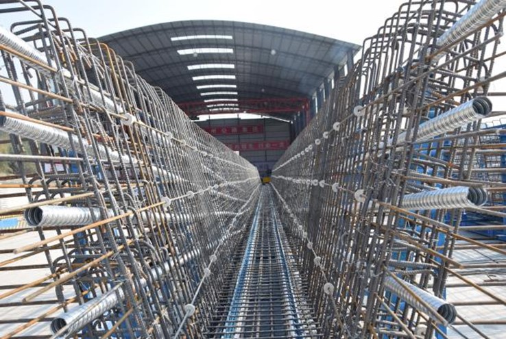 我标段预制梁场按“标准化、信息化、统一化”于一身的封闭式预制厂模式进行打造,做到T梁、箱梁钢筋加工和吊装、模板准入到梁板浇筑全过程的标准统一,实现集中化生产、工厂化流水作业。内设样板展示区、制梁区、钢筋加工区、生活区、原料储存区等;并在建设中将统筹规划,大力投入”四新技术“,包括液压式箱梁模板浇筑台车生产线、智能张拉及压浆工艺、钢筋定位绑扎模板胎架等,且积极开展“微创新”创建活动,为梁板施工质量的提升提供有效保障。
