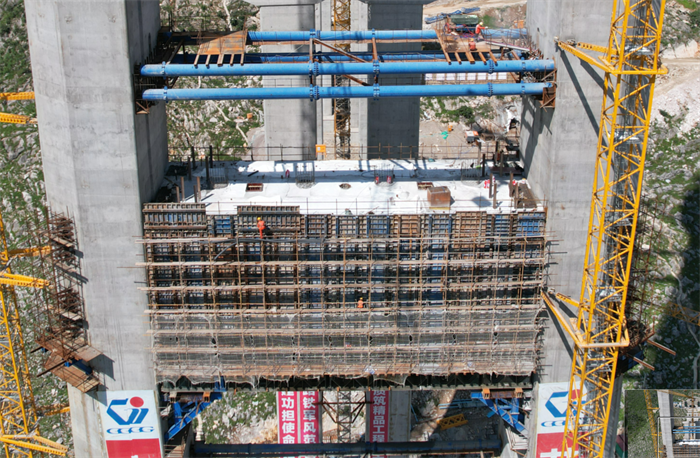 数台塔式起重机插入云霄,意味着600多米的深谷,262米的高塔又将创造另一个北盘江奇迹。高塔的腰部正在施工着关键工程部位--下横梁,工人们正在争分夺秒的安装着预埋件,配合着测量员精准的放样,将误差控制在允许误差范围内,展示了公司追求高精度,高品质的质量工程。下横梁作为5号主塔的主要结构部位,三阶段在项目部管理人员及施工队务24小时加班施工中于8月12日完成浇筑,意味着下横梁施工将告一段落。