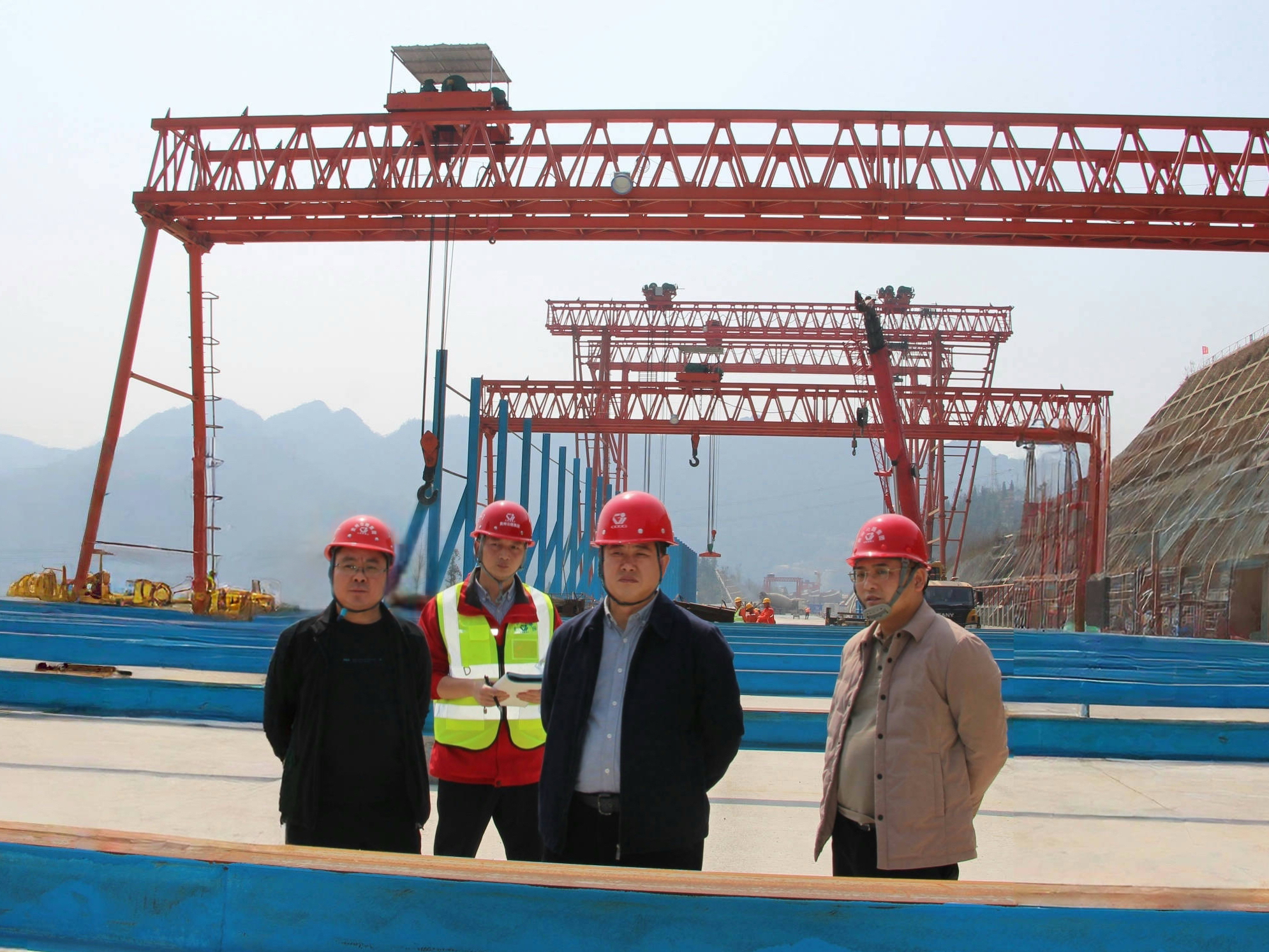 马白虎(右二)到项目拼装场检查安全工作
